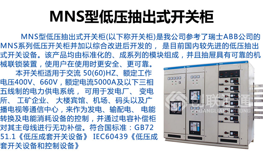 MNS型低壓抽出式開關柜適用于發(fā)電廠、變電站、石油化工、冶金軋鋼、輕工紡織等廠礦企業(yè)和住宅小區(qū)、高層建筑等場所,作為交流50~60Hz,額定工作電壓交流660V及以下的電力系統(tǒng)的配電設備的電能轉換、分配及控制之用。
