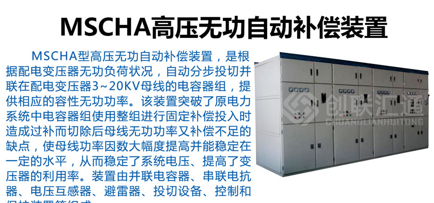 MSCHA型高壓無(wú)功自動(dòng)補(bǔ)償裝置,是根據(jù)配電變壓器無(wú)功負(fù)荷狀況,自動(dòng)分步投切并聯(lián)在配電變壓器3~20kV母線的電容器組,提供相應(yīng)的容性無(wú)功功率。該裝置突破了原電力系統(tǒng)中電容器組使用整組進(jìn)行固定補(bǔ)償投入時(shí)造成過補(bǔ)而切除后母線無(wú)功功率又補(bǔ)償不足的缺點(diǎn),使母線功率因數(shù)大幅度提高并能穩(wěn)定在一定的水平,從而穩(wěn)定了系統(tǒng)電壓、提高了變壓器的利用率。裝置由并聯(lián)電容器、串聯(lián)電抗器、電壓互感器、避雷器、投切設(shè)備、控制和保護(hù)裝置等組成。