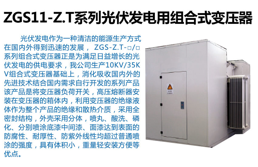 ZGS-Z.T-□/□系列組合式變壓器是消化吸收內(nèi)外的先進(jìn)技術(shù)結(jié)合內(nèi)需求自行開(kāi)發(fā)的系列產(chǎn)品,該產(chǎn)品是將變壓器,負(fù)荷開(kāi)關(guān),高壓熔斷器安裝在變壓器的箱體內(nèi),利用變壓器的絕緣液體作為整個(gè)產(chǎn)品的絕緣和散熱介質(zhì),采用全密封結(jié)構(gòu),外殼采用分體,噴丸、酸洗、磷化、分別噴涂底漆、中間漆、面漆達(dá)到表面的防腐性、耐厚性、防紫外線性均超過(guò)普通噴涂的強(qiáng)度,具有體積小,重量輕、安裝方便等優(yōu)點(diǎn)。