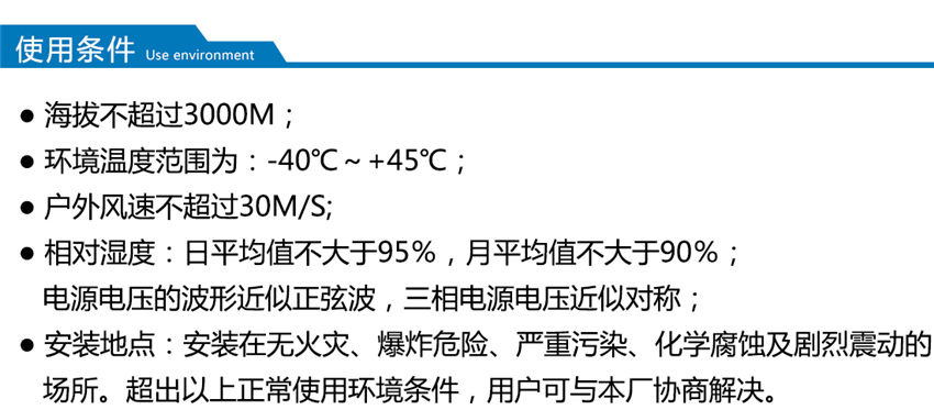 適用于自然條件比較惡劣的海灘、草原、荒漠等無(wú)火災(zāi)、無(wú)嚴(yán)重污染、無(wú)化學(xué)腐蝕介質(zhì)和粉塵、無(wú)爆炸性危險(xiǎn)運(yùn)行環(huán)境,可用于戶外、又可用于戶內(nèi)。